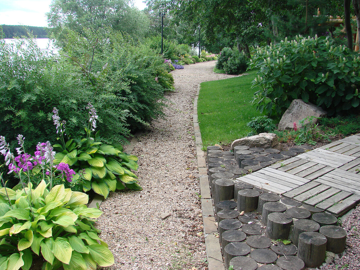 Когда стоит применять капитальное мощение из, скажем, брусчатки? Однозначный ответ дать сложно, но применять дорогостоящее мощение стоит в тех случаях, когда этого однозначно требуют избранный стиль ландшафтного дизайна, отделка строений или предстоящие серьёзные нагрузки. В всех остальных случаях можно и нужно рассматривать и оценивать альтернативные, легкие технологии мощения. Например - всем известные гравийные дорожки. У многих, к сожалению, возникают воспоминания о том, как же тяжело перемещаться по гравийной или щебеночной насыпи, или галечному пляжу, но подобные трудности создают только естественные (природные) насыпи щебня, гравия или гальки, а искусственная гравийная дорожка может стать исключительно удобной и качественной, надо просто обеспечить выполнение нескольких условий. Каких именно? Во-первых, тщательная подготовка основания для гравийной дорожки (трамбовка, формирование подушки из последовательных слоев песка и щебня и т.п.), разделение основания дорожки и основ
