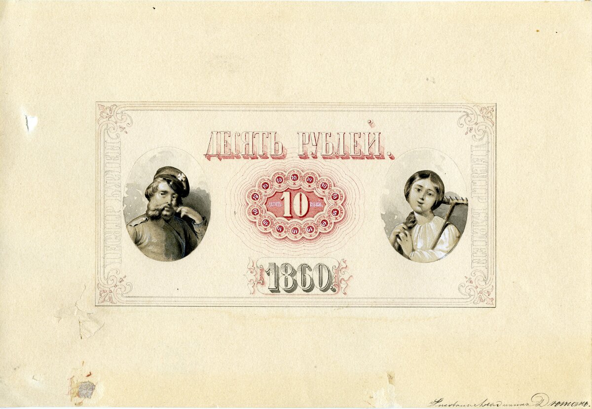 Новый выпуск посвящен эскизам кредитных билетов 1860-х годов.