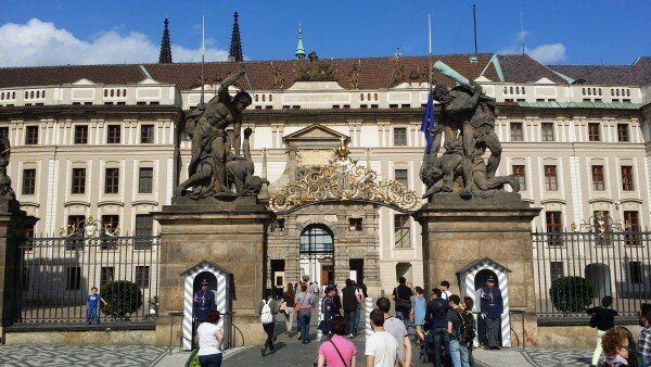 Перед нами парадные ворота для входа в Пражский Град. У ворот - почетный караул. Кстати, во многих городах Европы наблюдать за сменой караула - это целое мероприятие, на которое собираются посмотреть толпы туристов. Часто экскурсионные группы приводят к воротам в это время, но на мой взгляд в Праге так много интересных мест, что тратить время экскурсии на смену караула просто не правильно. Кстати, не могу сказать, что караул вызывает сочувствие. Это вполне себе по погоде одетые бравые молодцы в солнцезащитных очках, которые на мой взгляд охотно позировали фотокамерам. Говорят, что не так то просто получить место в почетном карауле, это привилегия избранных. Идем дальше.
