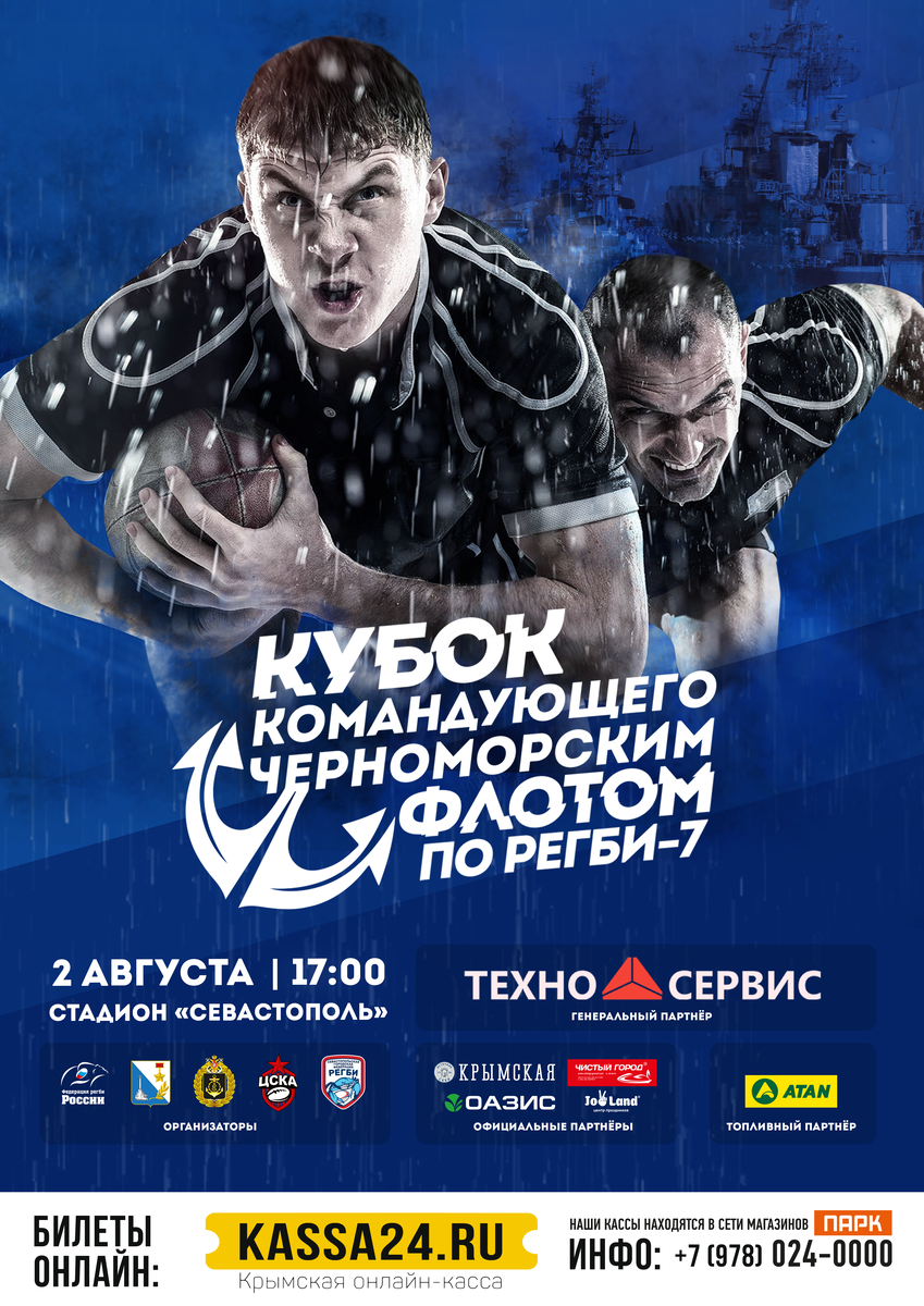 В Крымские кассы поступили билеты Кубок командующего Черноморским флотом по регби-7, приуроченный ко дню военно-морского флота Российской Федерации. В турнире примут участие восемь команд, которые и разыграют трофей между собой. Игры Кубка пройдут 1 и 2 августа по адресу: г. Севастополь, улица Брестская д. 21 на стадионе СОК «Севастополь». Начало в 17:00. Во время матчей Кубка будет проведена лотерея для зрителей, главный приз которой - автомобиль УАЗ hunter. Для детей будет организованна зона активностей: аквагрим, воздушный городок, батуты, конкурсы с ценными призами от официальных спонсоров. Билеты на мероприятия можно приобрести у билетного агрегатора KASSA24 и в кассах стадиона. https://sevastopol.kassa24.ru/event/kubok-komanduusego-cernomorskim-flotom-po-regbi Список адресов, где можно приобрести билет: г. Алушта, ул. Владимира Хромых 22 г. Симферополь, ул. Горького 1. г. Симферополь, ул. Механизаторов, 51, ТРЦ FM г. Симферополь, Евпаторийское ш. 8, ТРЦ Меганом г. Симферополь,