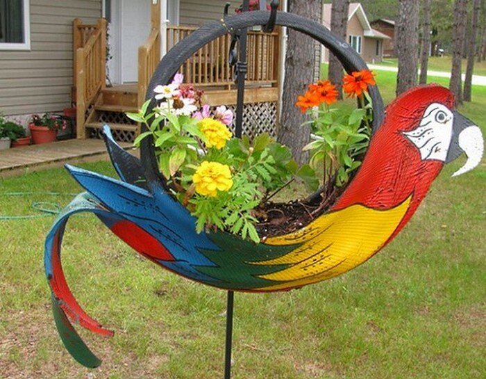 Множество украшений для сада, делается из автомобильных покрышек. Когда-то это красиво, когда-то не очень. Но вот одна поделка, всем хороша. Яркая, веселая и довольно необычная. Чем мы хуже других, подумала я и решила сделать вместе с вами, красивого попугая.