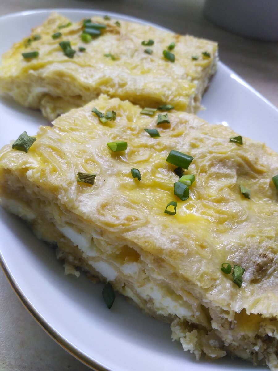 Накрываем следующим пластом лаваша и заливаем частью молочно-яичной смеси.