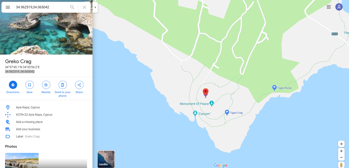 Для исследования я выбрал самый высокий по рейтингу и самый близкий к отелю район — Greko Crag. Район располагается в 7 км от Айя-Напы. Место легко найти в Google картах по следующим координатам: 34.962519, 34.065042