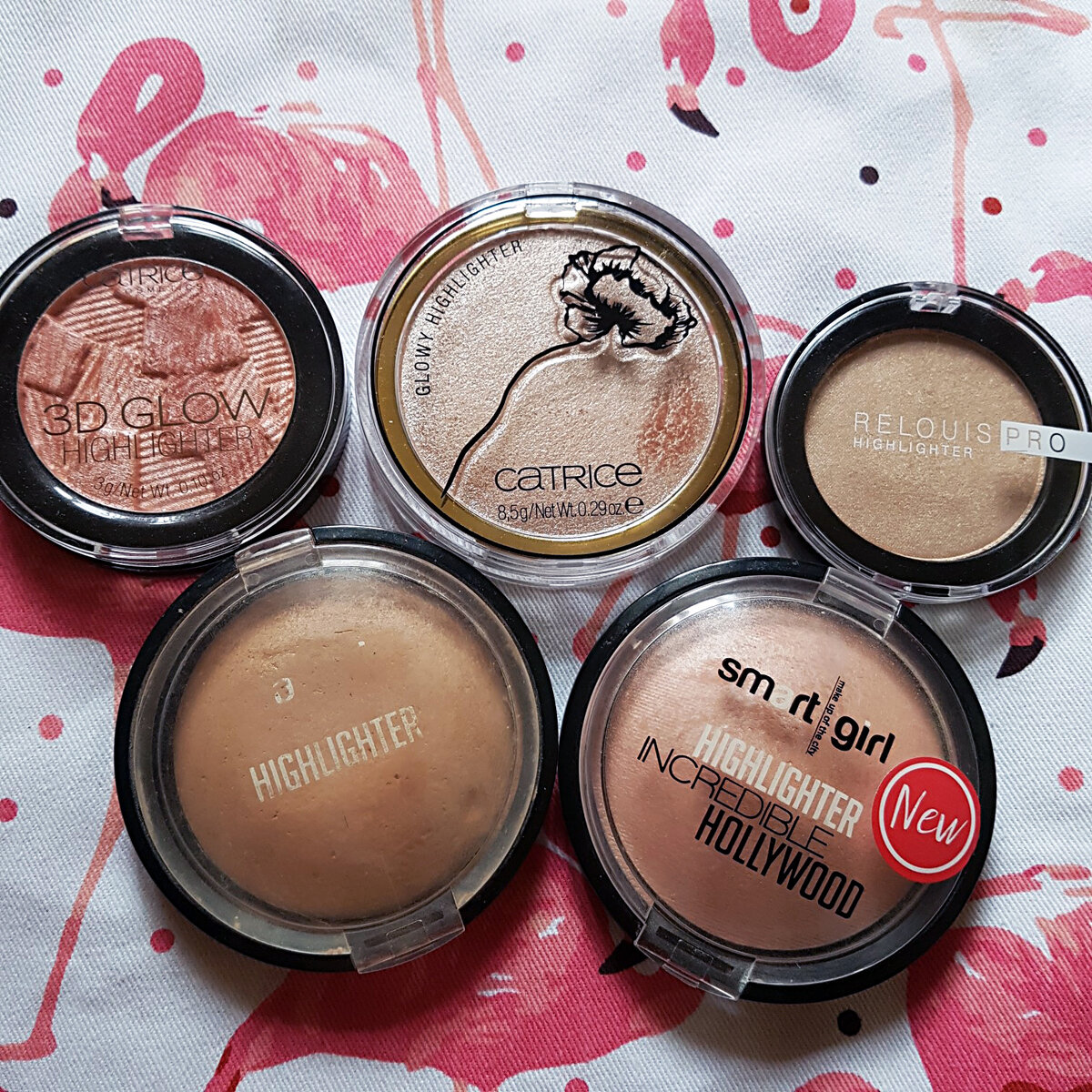 У меня есть несколько критериев плохих средств для подсвечивания лица: слабая пигментация, меловая текстура, крупные сияющие частицы. В данной подборке этим не грешит ни один. BelorDesign "Smartgirl Incredible Hollywood" ~ 350p. Хайлайтер представлен в двух оттенках, изначально купила в 01 тоне, затем докупила 02. Текстура шелковистая, легко переносится кистью, пигментация очень достойная, самого продукта целых 7.3 грамма, оттенок 01 похож на знаменитый "Moonstone" от Becca. Сияющие частички очень мелкие, неразличимые при близком рассмотрении. Из минусов могу выделить хлипенькую упаковку, со временем все надписи на упаковке стираются, выглядит не очень презентабельно. Такой хайлайтер подойдёт на каждый день. Catrice "3D glow highlighter" ~ 300p. У хайлайтера очень хорошая пигментация, сияние ярко выраженное, но при этом крупных частичек не наблюдается. Средство имеет