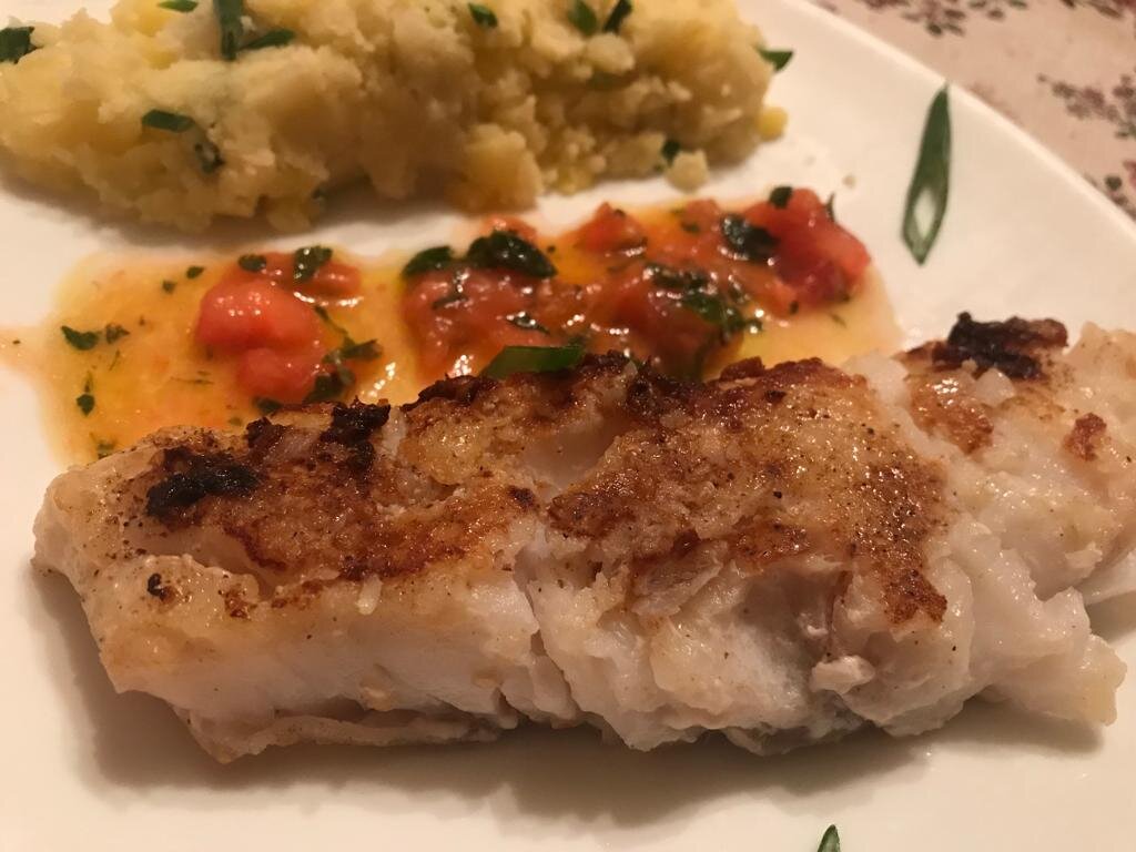 Мой муж увлекается кулинарией и периодически смотрит на YouTube каналы всяких шеф-поваров – российских и зарубежных, известных и не очень. И так же периодически приносит из этих роликов всякие «полезности». Этот рецепт приготовления жареной трески он тоже почерпнул в каком-то видео. Раньше я эту рыбу покупала очень редко. Хоть и недорогая, но как-то постоянно она у меня получалась сухой и невкусной – до тех пор, пока не попробовала пожарить ее новым способом. Сейчас все подробно расскажу. Сначала, как обычно, ингредиенты: · филе трески на кожи; · растительное масло; · соль и молотый перец; · 1 помидор; · 2 столовые ложки оливкового масла; · 2-3 веточки свежей мяты; · лимон. Последние четыре ингредиента понадобятся для соуса. Если не хотите, его можно и не делать – но я все-таки рекомендую попробовать. Готовится он элементарно, но при этом прекрасно дополняет вкус рыбы. Сначала делаем соус. Помидор нарезаем небольшими кусочками и кладем в пиалку. Добавляем туда же порезанные листья све