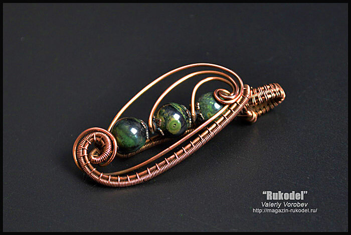 Соскучились по творческой работе? Да!? Тогда потрудимся и создадим вот такое чудесное украшение из простой медной проволоки и трех бусин в технике Wire Wrap. Используем медную проволоку толщиной 1 мм и 0,4 мм. Если собираетесь сделать более миниатюрное украшение используйте пару 0,8 мм основная и 0,3 мм проволока для оплетки. Три бусины от 6 до 10 мм. Я добавил еще специальные шапочки для бусин цвета античной меди. На видео смотрите способ оплетки двух основных проволок. Как оплетать три проволоки смотрите на видео ниже. Бусины лучше всего использовать из натурального камня (вулканического происхождения) или из стекла (не пластика!!!). На первый взгляд все очень сложно. На самом деле - с годик потренируетесь и все получится. ЭТО БЫЛА ШУТКА Отдаленно напоминает стручок гороха. Концы у проволок прячем. Кому то придется носить ваше творение, не дай бог повредить одежду. Практически - готово. Осталось (при желании) запатинировать и отполировать. Как и чем? Читайте предыдущие статьи. Валери