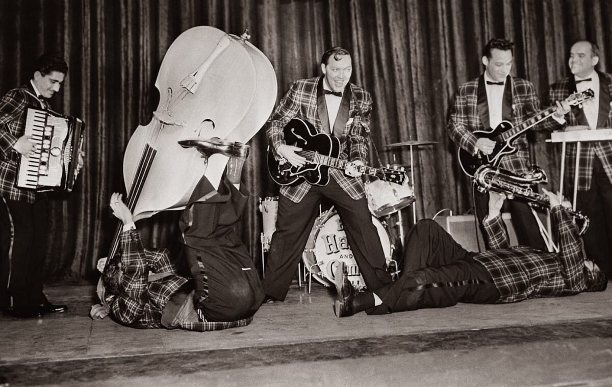 (Что касается самой песни, то авторы, Фриман и Майерс, в своё время действительно сочинили её для Хейли, но у того не нашлось времени, так что первую запись сделала другая группа; потом Билл снизойдёт – однако сингл будет иметь весьма скромный успех, пока не прозвучит в саундтреке фильма «Школьные джунгли»… тут-то и начнётся международный триумф песни – и рок-н-ролла как такового, хотя придирчивые критики утверждают: «Rock Around the Clock» не был ни первым рок-н-роллом, ни даже первым чарт-топпером в истории жанра).