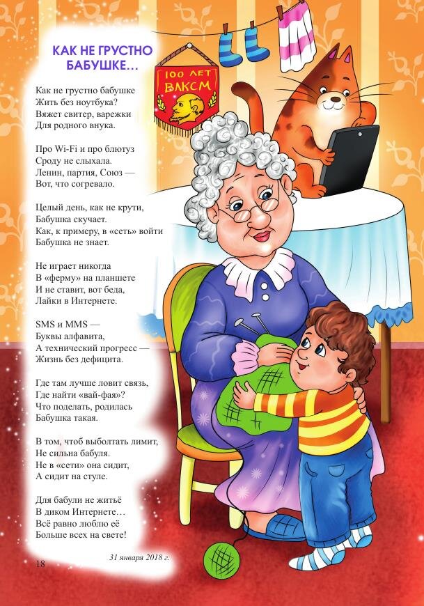 Для бабули не житьё В диком Интернете… Всё равно люблю её Больше всех на свете! Иллюстрация из книги М. Сафиулина и О. Фокиной "Небо радужного цвета" https://www.youtube.com/watch?v=JweHGhlofWI
