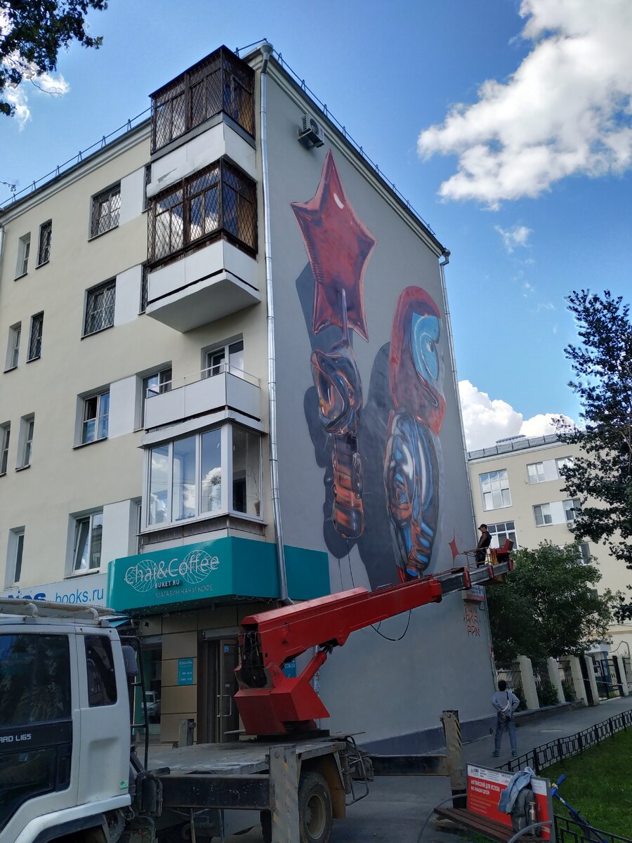 Вообще тут рассказываю в основном про края далёкие да материи высокие. Но и ставший мне пристанищем Екатеринбург настолько красив, что остановиться и приглядеться нужно обязательно. Сегодня вот на улице Попова рисуют что-то с милыми сердцу красными звёздами. А на следующем здании роспись воистину удивительная! Будущее ближе чем кажется! А следом за появляющимися в нашей жизни роботами с обветшавших страниц газеты "Труд" грозится вернуться... Феликс Эдмундович Дзержинский... Умеет порой удивить Урал, ох умеет...