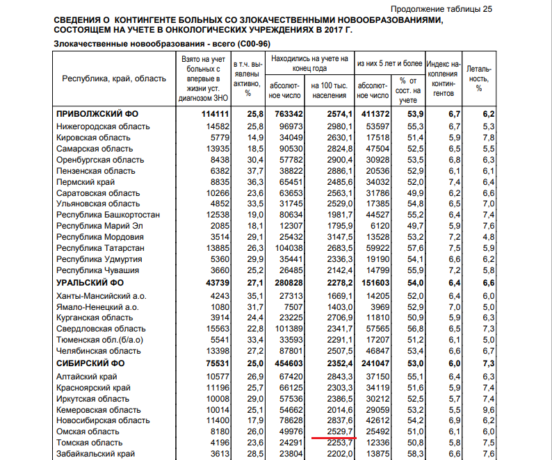 В СФО традиционно по числу стоящих на учете онкологических больных лидируют Алтайский край и Новосибирская область. Это если смотреть в % от числа населения. По абсолютным показателям лидирует Новосибирская область, потом идут Красноярский край, Алтайский край, Кемеровская и Иркутская области.