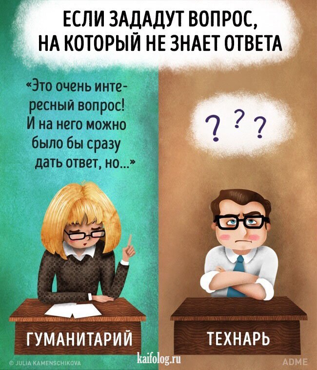 Около 45% людей, испытывая трудности, связанные с математическими вычислениями, в оправдание своих "неудач" заявляет, что он "гуманитарий". Другие 45% - когда не могут или не знают, как выразить свою точку зрения, кричат, что они не гуманитарии, и что они не собираются распинаться ни перед кем. (Остальные 10% - врачи).