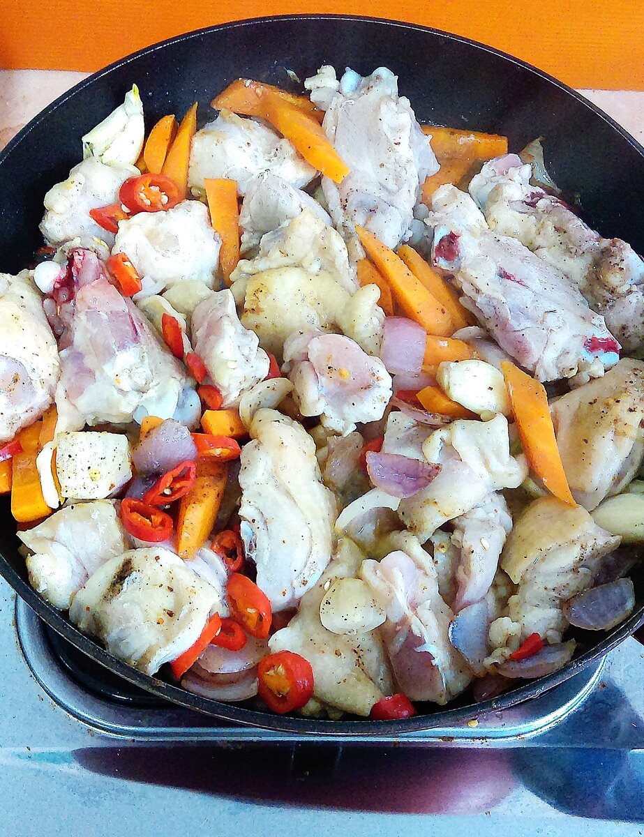 - Мясо 800 гр (любое, с жирком. Мясо без жира будет сухим в плове. Например я люблю плов из куриных бедрышек, хотя кто-то начнет возмущаться, что мол, из кур плов не готовят. Ха, готовят. Можно взять баранину, можно довольно жирненькую свинину) Нарезать кусочками 5-7 см,