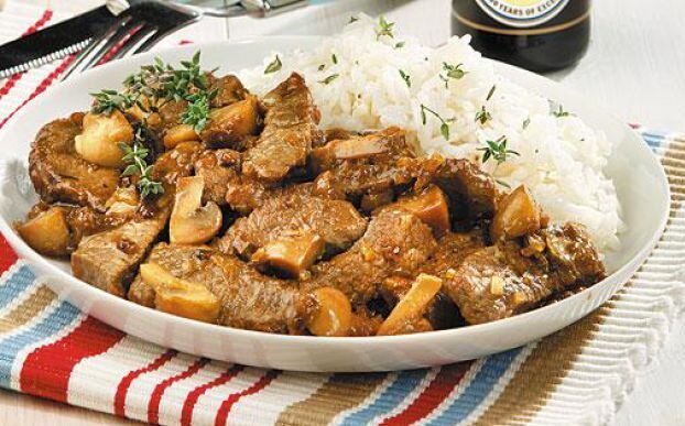 Нарезаем мясо крупными кусочками. Обжариваем его до полуготовности вместе с томатной пастой. После чего добавляем мелконарезанный репчатый лук, грибы и болгарский перец. Обжариваем все вместе 5-7 минут. Подливаем в обжарку воду, добавляем лавровый лист, соль, перец и тушим под закрытой крышкой на слабом огне до готовности. Выкладываем на блюдо мясо, поливаем получившимся соусом и украшаем рубленой зеленью.