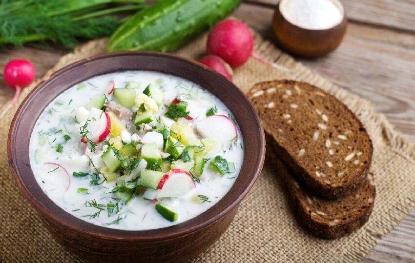 В 1 литре воды размешать сметану, добавить и перемешать с нарезанными продуктами, затем добавить остальную воду до нужной густоты.