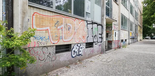 У Германии огромное количество плюсов, про которые вы уже не раз слышали: стабильность, высокий уровень жизни, свобода слова и самовыражения и прочие райские кущи. Но у всего этого есть обратная сторона – высокие налоги, монополии, деление людей на классы и тому подобное. К тому же, те самые вышеперечисленные плюсы привлекают в Германию огромное количество людей со всего мира. Вот как меня, к примеру! И переселенцы, профитируя от плюсов Германии, не всегда готовы мириться с ее минусами. Так, они обычно плевать хотели на немецкий порядок и чистоту. Возьмем для примера Берлин – город с одним из самых высоких показателей иностранцев среди населения. Есть в Берлине немецкие районы – чистенькие и ухоженные. А есть районы эмигрантские. И по такому району мы сейчас с вами пройдемся. Сперва глаз всегда натыкается на граффити на стенах. Это так - самое начало. Давайте же повернемся! Это фото с того же места. В теории это должны были быть контейнеры для сборки стекла. Видите - стекло различаетс