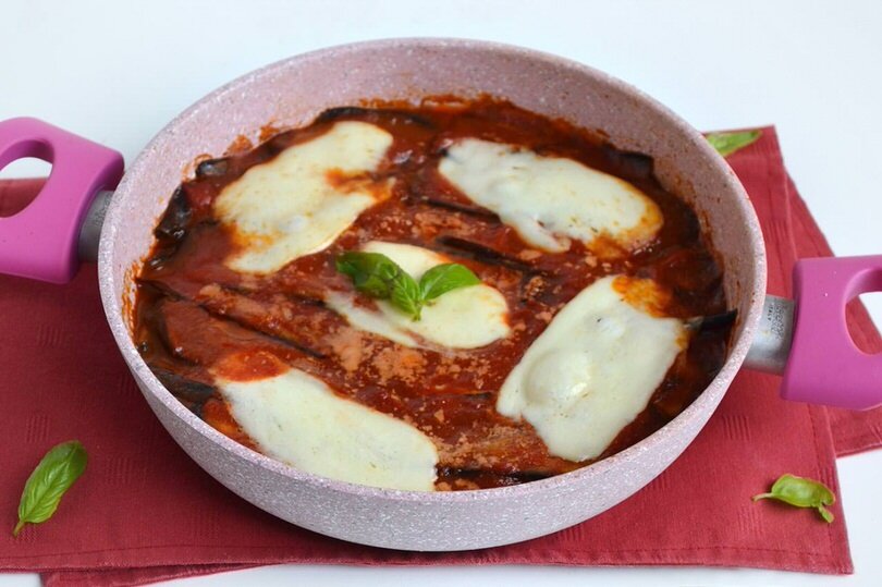 Баклажаны на сковороде - довольно простой и хитрый рецепт, чтобы подать к столу вкусное, необычное и ароматное блюдо, не потратив много времени и сил). Для 4 человек подготовьте: 4 баклажана 500 мл томатного пюре 200 гр сыра моцарелла 20 гр тертого сыра 1 зубчик чеснока масло соль базилик Промойте и очистите баклажаны, а затем нарежьте вдоль на довольно тонкие ломтики. Варить их в широкой сковороде со смесью из воды и масла. После приготовления, приправить солью. Приготовьте соус, для этого смешайте чеснок, масло, базилик, соль и томатную пасту, варите в течение нескольких минут. Положите несколько ложек соуса на дно глубокой сковороды. Добавьте слой баклажанов. Сверху положите еще немного соуса, затем добавьте моцареллу, порезанную на тонкие ломтики. Сверху положите еще один слой баклажанов, приправьте соусом и тертым сыром. Положите третий слой баклажанов, сверху полейте оставшимся соусом, положите моцареллу и посыпьте оставшимся тертым сыром. Накройте крышкой и готовьт