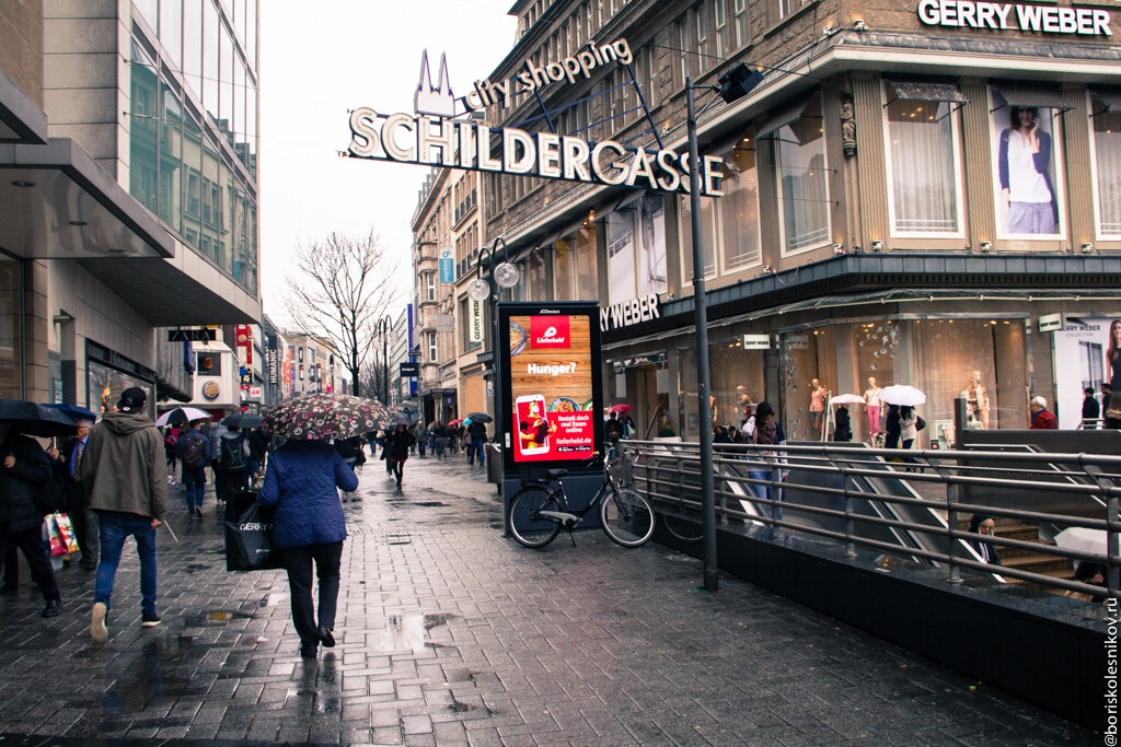 Весенний Кёльн достаточно смурной и прохладный. Немцы спешат каждый по своим делам. Все идут достаточно быстро, с поднятыми воротниками на куртках, в шапках и с зонтами. Постоянно моросит мерзкий дождь. Город-миллионер Кёльн является четвёртым по населению и третьим по площади городом Германии, а также одним из крупнейших экономических и культурных центров страны. Центральный собор города — Kölner Dom. Римско-католический готический собор в Кёльне. Занимает третье место в списке самых высоких церквей мира и внесён в список объектов Всемирного культурного наследия. Бездомные одеты явно не по погоде. Внутри красота, фотографиями ее не передать, конечно. Нужно смотреть и наслаждаться живьем. Витрины просто приваривают глаза и не дают оторваться. По окончании строительства 157-метровый собор на четыре года стал самым высоким зданием мира. Лучи солнца играют в красках. Свечи абсолютно бесплатные, как и в любом соборе Германии. Вид сверху. Туманный Кёльн. Крыши домов и колесо обо