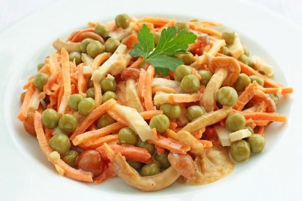 Ингредиенты:Морковь по корейски - 300гОпята (маринованные) - 280гГорошек (конс) 200 гВетчина 150грКартофель - 2 шт.МайонезСпеции