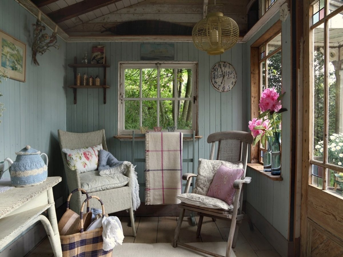 Не бойтесь использовать текстильные предметы декора. Ни один дачный домик не обойдется без уютных занавесок, скатертей, подушек и ковриков, использующихся в декорировании стен, мебели и пола. Это позволит украсить окна и оградить внутреннее пространство от солнечного света.