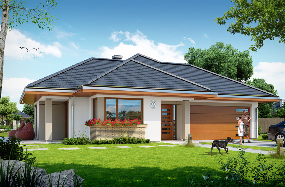 Дом, представляет собой здание, которое сочетает в себе функциональность с интересной архитектурой и замечательными решениями. Его форма имеет форму вытянутого прямоугольника с добавленными поперечными формами гостиной и гаража. Все увенчано многоскатной крышей с небольшим углом наклона. Обращает на себя внимание большое остекление, благодаря чему интерьеры прекрасно освещены и идеально открыты для сада. Дом выделяется современным внешним видом, а его сложные отделочные детали создают гармоничную композицию. Здание также должно быть недорогим для строительства и обслуживания. Входная дверь в дом находится в аркаде. Внутри есть прихожая, в которой мы также можем найти дверь в большой гараж. Две машины будут удобно припаркованы в гараже. Выйдя из зала, вы окажетесь в холле с лестницей, ведущей на чердак. Приспосабливая проект, вы можете изменить функцию этой комнаты и использовать ее для других целей. Открытое пространство гостиной впечатляет своей оригинальной формой и простором. С ли