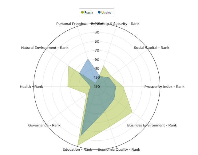 Сегодня хочу поделиться интересными данными, а именно сравнением уровеня жизни в России и на Украине, а также как он менялся за последние несколько лет. Для анализа используются данные британского института "The Legatum". Данный институт ежегодно делает индекс процветания по разным странам. Так, на графике снизу графически в виде паутины изображены данные по последним исследованиям, которые актуа