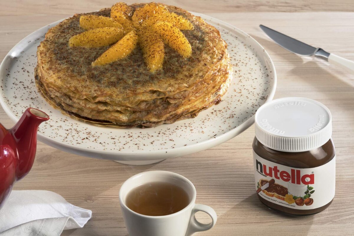 1 рецепт: "Французский блинный торт с Nutella и апельсиновой цедрой" Ингредиенты: Молоко 600 мл Сахар 50 г Соль щепотка Яйцо куриное 6 штук Сливочное масло 50 г Пшеничная мука 200 г Ванильный стручок 1 штука Апельсины 1 штука Сливки 33%-ные 500 мл Какао-порошок 20 г Nutella 200 г Горький шоколад по вкусу Приготовление: 1. Растопить сливочное масло, смешать его при помощи венчика с молоком, сахаром, щепоткой соли, яйцами, семенами ванили и апельсиновой цедры (важно не снять слишком много цедры, белая часть может дать блинам горечь) до однородной консистенции. Все ингредиенты для теста должны быть комнатной температуры. Накрыть тесто пленкой и убрать в холодильник на 3 часа. 2. Растаявшееся, пропитанное ароматами тесто перемешать еще раз венчиком и процедить через сито. 3. Печь блины на раскаленной сковороде, смазывая ее тонким слоем растительного масла. 4. В чашу влить сливки, добавить какао и взбивать на средней скорости до твердых пиков. 5. Очистить апельсин, с которо