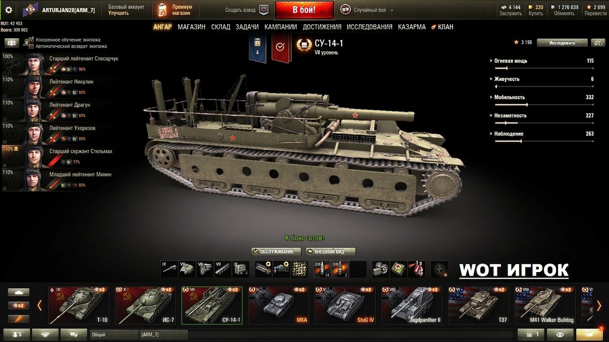 2. Гаубичное 203 мм орудие ''Б4'' Несмотря на десятилетнюю работу проектировщиков и конструкторов, всего было выпущено 2 опытных экземпляра. Машина получилась громоздкая, с малым боекомплектом, с трудностями при перезарядке орудия. Представьте себе, гаубичное орудие перезаряжалось приблизительно 6 минут, при этом использовались оба крана, которыми была оснащена наша установка. Что касается нашей игры, СУ-14-1 является одной из полюбившихся машин наших игроков. Каждый из нас много раз встречал СУ-14-1 на полях сражений, и каждый из нас хоть раз получал тот огромный у