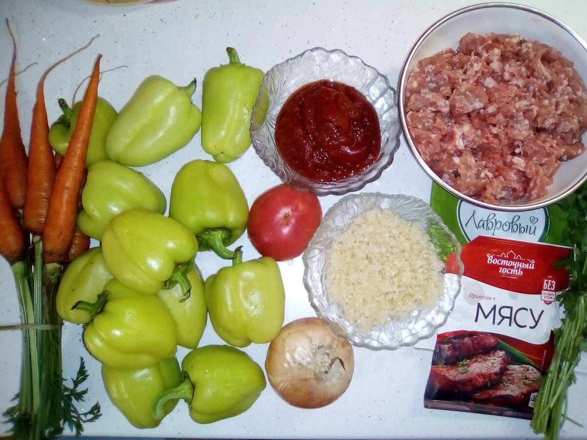 Середина лета – время болгарского перца. Сейчас его продают на рынках в большом количестве, и цены упали до приемлемых. Я купил болгарский перец по цене 50 рублей за килограмм. Фаршировать стану классическим "советским" способом. Продукты: Болгарский перец – 1,2 кг Свиной фарш – 700 гр. Морковь – 5 шт. (небольших) Помидор – 1 шт. Луковица – 1 шт. Томатная паста – 5 ст. ложек Рис – 100 гр. Зелень (петрушка + укроп) – 1 пучок Вода – 1 л Растительное масло для жарки – 1 ст. ложка Соль – 2 чайные ложки Специи. Промытый рис отвариваю и оставляю охлаждаться. Это - первым делом. Пока он охлаждается, занимаюсь овощами. Морковь я купил молодую, свежего урожая. Та связка, что на фото, обошлась в 15 рублей. Чищу её и измельчаю на мелкой тёрке. Помидоры и лук нарезаю кубиками. Болгарского перца понадобилось много, весь на фото не поместился. Аккуратно вырезаю сердцевину каждого перчика, промываю, чтобы не осталось семечек. Смешиваю в миске фарш, рис, лук, половину тёртой моркови, помидор, рубленую
