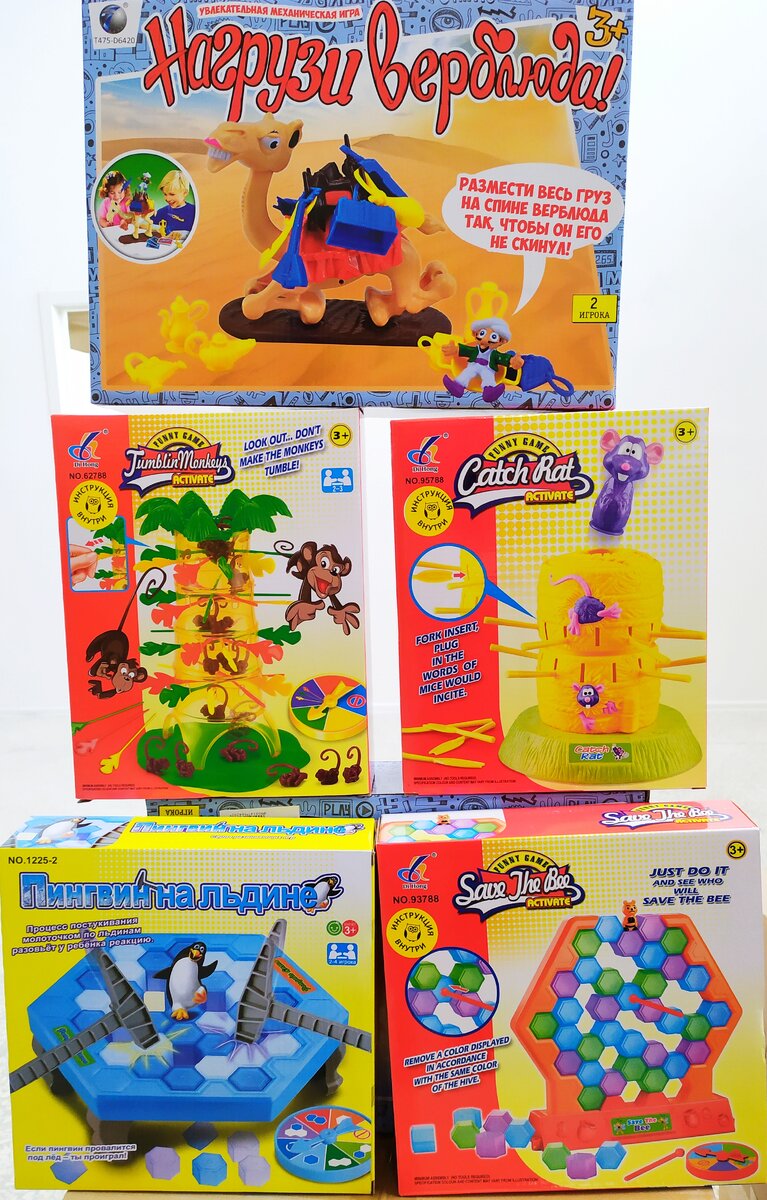 Сегодня делаю подборку весёлых игр для детей от 3 лет. Что важно в этом возрасте для ребенка? Какой должна быть игра, что бы его развеселить и удержать? Правильно - веселой и не длинной по времени. Одна игра займет несколько минут. В этих играх большой упор на элемент удачи и азарта, но и для развития ребенка есть плюсы. Например они развивают коммуникабельность, ловкость, сообразительность. Принцип этих игр очень простой, дети сами легко смогут все понять и играть вместе, а возможно и придумают новые правила для игры. От клиентов слышал, что и взрослые могут просидеть за подобными настолками несколько часов, а кто-то говорит, что они быстро надоедают их детям, но положительных отзывов больше. Пингвин на льдине - суть игры проста, сначала игроки собирают поле из льдинок разного цвета, затем поочереди крутят рулетку и выбивают киркой льдины того цвета, что указала рулетка. Проиграл тот на чей ход пингвин ушел под лед. Всё просто! Спасти пчёлку - эта игра как пингвин на льдине, только