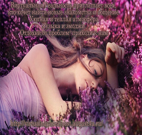 Одиноко? Хочется отдыха и понимания? Приходи к нам. В Виртуальной Реальности можно отдохнуть и пообщаться на самые разные темы. Найти новых друзей, знакомых, а может быть и свою вторую половинку. Послушать любимую музыку. Дополнить свой текст красочными смайлами и анимацией. Уютная и комфортная атмосфера. Виртуальная Реальность - это твой выбор общения!