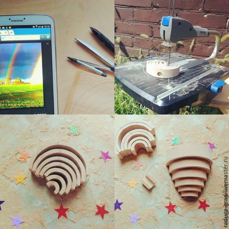 Сегодня сделаю небольшое отступление от темы мастер- классов и расскажу как появились в моем ассортименте игрушки из дуг (радуги). Думаю, мой опыт будет многим полезен, т.к на протяжении нескольких лет подряд радуги были и остаются неизменным хитом продаж. Все началось с покупки небольшого настольного лобзика для хобби. Хотелось сделать своими руками ребенку необычную игрушку. Радуги или игрушки из дуг были желанными игрушками для производства с самого начала образования моей мастерской. Я начал их выпиливать из клееных буковых щитов. Даже не умея делать радуги, в названии мастерской я постарался запрограммировать их наличие в своем ассортименте: Мастерская Raduga Grad = Радуга Градъ = Город Радуг. Моя первая радуга была пирамидкой. Дуги имели отверстия, через которые они надевались на основание с осью. Очень сложная в изготовлении модель для начинающего, скажу я Вам. Я старался привлечь покупателей большим ассортиментом вариантов расцветок, самых необычных. Мы вдохновлялись ф