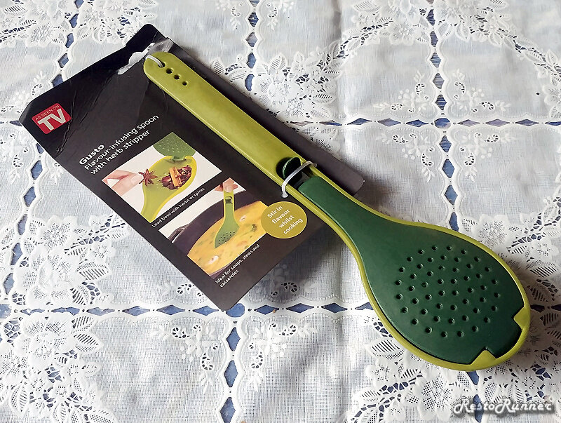 При доставке помялась только картонка, но зато на ней видна еще одна полезная функция ложки. В ручке есть дырочки четырех размеров. Они позволяют мгновенно разделить зелень на листья и стебли. Листья