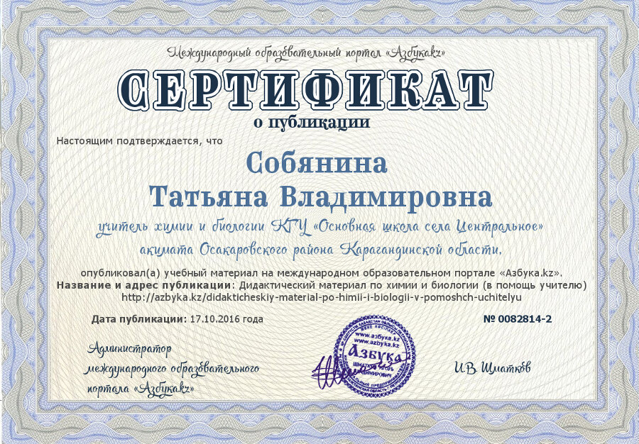 В подтверждение публикации уроков, разработок внеклассных мероприятий, статей на портале Азбука.kz электронный сертификат высылается бесплатно.