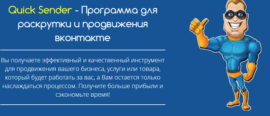 Quick Sender - Инструмент для раскрутки группы и продвижения ВКонтакте. Вы получаете эффективный и качественный инструмент для продвижения ВКонтакте вашего бизнеса, услуги или товара, который будет работать за вас, а Вам остается только наслаждаться процессом. Получите больше прибыли и сэкономьте время! Почему выбирают нас ?? Сокращает временные затраты на 87% Программа берет на себя всю рутинную работу: рассылка приглашений, поиск аудитории, работа с клиентами. Вам только остается наслаждаться процессом выполнения. Бесплатные обновления программы Платите 1 раз - и все!