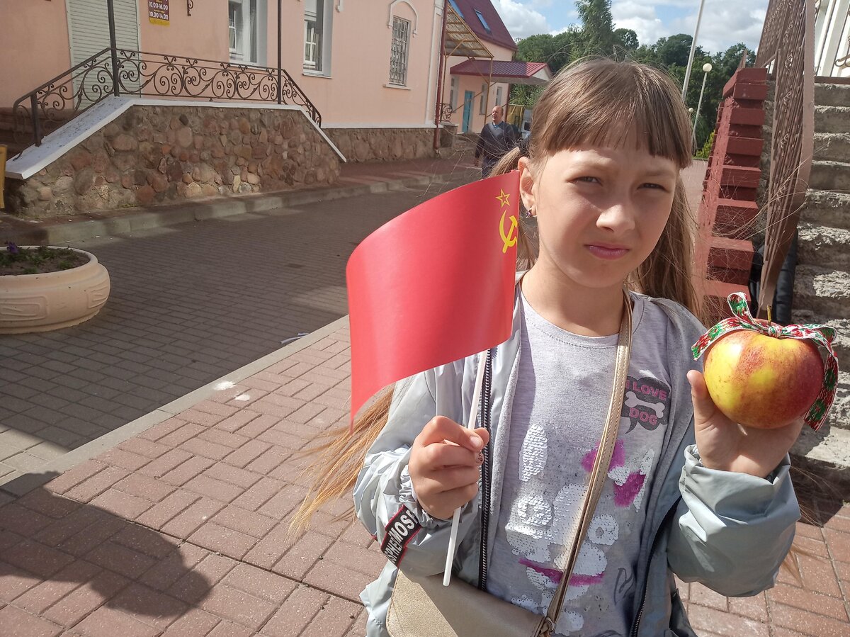 Ну не могли мы в такой день остаться дома. Как только пришли, какая-то девушка подарила дочке яблоко, перевязанное ленточкой с национальным узором (аналог Георгиевской).