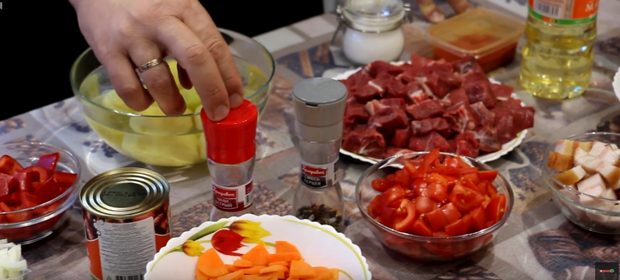 Ингредиенты Режем овощи и мясо, в разогретый казан добавляем нарезанную грудинку, вытапливаем и убираем шкварки. В вытатапившийся жир добавляем лук и обжариваем до прозрачности,добавляем морковь(жарим 5 мин), следом 2-2,5 ст. л. паприки, перемешиваем.Добавляем мясо, жарим минут 5-7 постоянно помешивая, солим. Добавляем болг.перец, перемешиваем и добавляем фасоль, тушим 2-4 мин.Добавляем воду(кипяток)чтобы скрыло мясо с овощами, накрываем крышкой и оставляем на среднем огне, минут на 10 Через 10-12 мин. добавляем помидоры, доводим до кипения, потом убавляем огонь, накрываем крышкой и на медленном огне тушим час, полтора.А тем временем идём делать чипетки .Разбиваем яйцо,немного соли,добавляем муку до состояния тугого теста Тесто заворачиваем в плёнку и даём ему отдохнуть минут 20-25, разворачиваем тесто и делаем чипетки. Режем картофель(не мелко),через полтора часа в казан добавляем картошку, пробуем на соль, перец, если надо добавляем, добавляем чеснок, накрываем крышкой и варим 7 ми