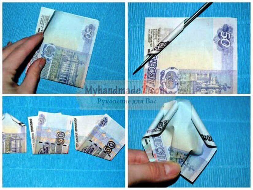 • Складываем купюру пополам, надеваем на середину купюры резинку, и кончики купюры