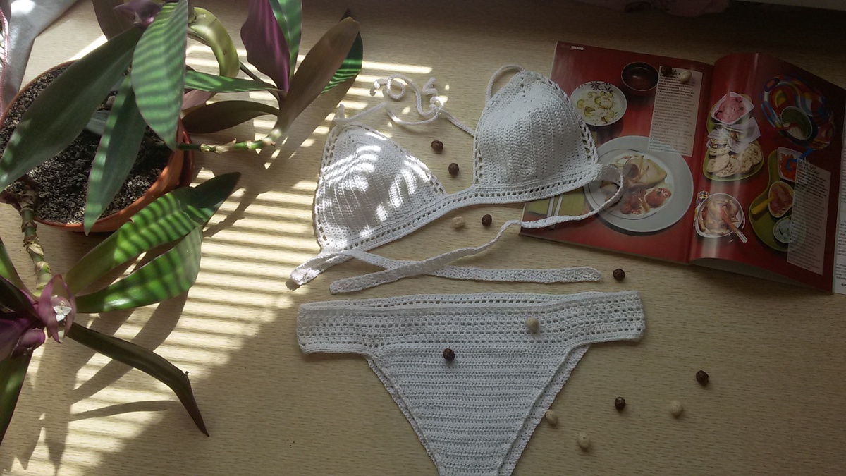 Белый вязаный купальник-это очень эффектно,особенно на загорелой коже. Вы однозначно будете привлекать внимание:мужчины будут смотреть восхищенно,ну а женщины,скорее,с завистью. Но это ничего,главное как вы будете себя чувствовать-самой,самой,самой! Я связала себе такой купальник и ничуть не пожалела. Мне очень нравится этот процесс,ну а результат и подавно. Теперь хочется и черный и красный и еще много разных...Черный,кстати,в процессе. С удовольствием свяжу и доя вас!