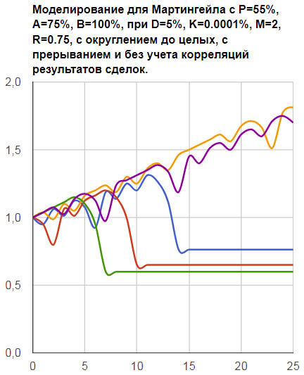 В этом случае прервать использование стратегии Мартингейла уже может 5 последовательных проигрышей. На 60 сделках вероятность встретить такую серию проигрышей будет примерно 0.7. То есть из 5 случаев стратегия Мартингейла прервется примерно в трех или четырех случаях.