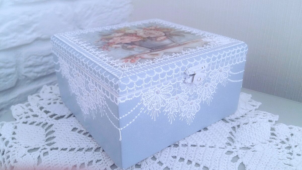 Декор шкатулки в нежных тонах. Декупаж и кружевная роспись.