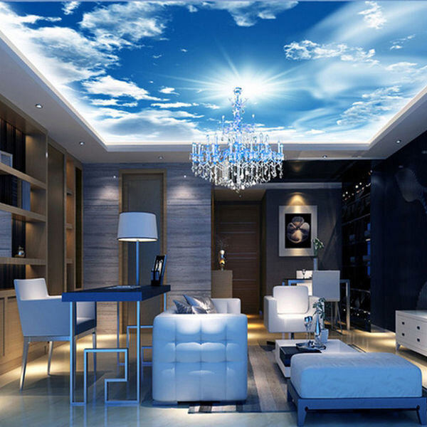 Если потолок выровнен, прогрунтован и готов к дальнейшему ремонту, а в квартире влажность, то можно подумать о замене побелки обоями. Это поможет придать интерьеру уникальность — можно сделать на потолке звездное небо, облака, полоску, крапинку или вообще заказать свою фотографию в типографии — здесь фантазию не ограничивает ничто.