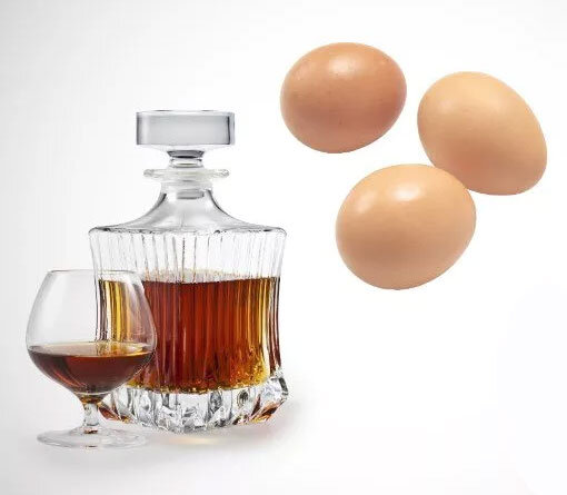 Обычно яйца с коньяком смешивают непосредственно перед тем, как наносить на волосы, и не хранят средство. Поскольку яйца быстро вступают в реакцию с коньяком, именно на этом взаимодействии и основано интенсивное воздействие масок с этими компонентами Маска для волос с коньяком и яйцом делается в пропорции: одно яйцо плюс две-три столовые ложки коньяка. Если хотите увеличить увлажняющее свойство смеси, то добавьте в коньяк только желток. В такую маску можно добавлять самые разные компоненты: масла, витамины, промышленные кондиционирующие добавки. Не стоит только смешивать яйца с коньяком с отварами натуральных трав, желток закроет чешуйки волоса, и никакого полезного действия у такой маски не будет, кроме обычного. Лучше ополосните отваром волосы после маски. Маска для волос с коньяком Вообще в этот алкогольный напиток можно добавлять самые разные ингредиенты и создавать идеальное ходовое средство именно для ваших волос. Рецепт: В столовую ложку горчицы (не горчичного порошка) вме