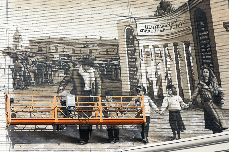 Почти месяц художник-монументалист Анна Дрыгнова работает над гигантской картиной, посвященной истории Центрального рынка Оренбурга. В этом году ему исполняется 140 лет. На стене одного из зданий рынка на площади около 180 квадратных метров, на перекрестке улиц Володарского и 8 марта, появилась огромная ретрофотография, рассказывающая об истории рынка. Фотография в стиле ретро – это коллаж из разных эпох, которые как раз удалось запечатлеть и уловить художнице. Сначала, по словам Анны, разрабатывался эскиз, потом уже начали работать над его воплощением в жизнь. Граффити согласовывалось с мэрией города. Оказалось, что стиль «ретро» очень нравится оренбуржцам. За время работы Анна услышала много хороших отзывов о необычной картине. — В этом граффити совмещены сразу несколько фотографий из разных эпох. Именно эту историческую перспективу мы и хотели показать. Для этого, конечно, изучались, старинные фото Оренбурга, — рассказала Анна Дрыганова «Оренбург Медиа». Полностью закончить картин