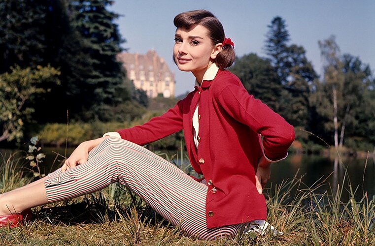 Актрису нечасто можно было увидеть в юбках и платьях, зато укороченные черные брюки быстро стали ее узнаваемой фишкой. Их Хепбёрн обычно дополняла столь же лаконичным верхом — белой рубашкой и свитером (как вариант — кардиганом), водолазкой или топом, изредка — жакетом. В выборе обуви она также была последовательна — балетки или туфли с микрокаблуком либо лоферы, которые можно смело назвать ее любимой обувью в целом.