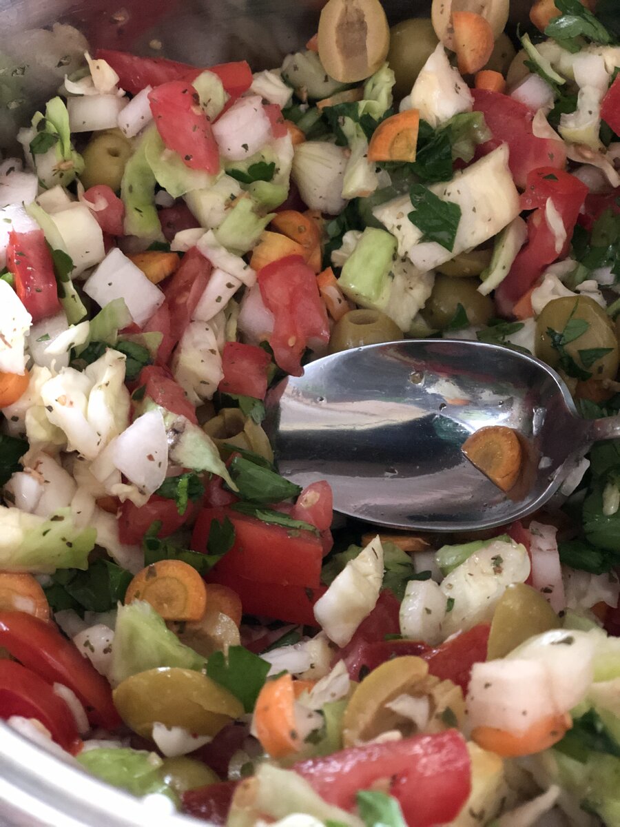 Для начала сделаем салатик из овощей, добавим зелень и соль по вкусу.