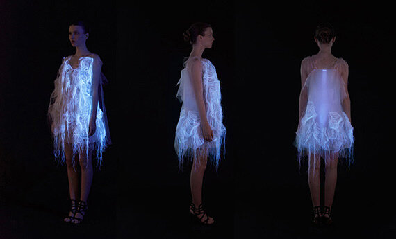 Мир моды находится в непрерывном движении, он постоянно устремлен к тому, на чем в данный момент сосредоточено внимание людей. Вероятно, именно эта банальная истина сподвигла канадского дизайнера японского происхождения Йинг Гао создать свои кинетические платья. Особенностью коллекции является то, что каждая модель оснащена уникальной системой отслеживания направления человеческого взгляда. Как только система под названием «eye-tracking» улавливает направленный взгляд, запускаются миниатюрные моторчики, спрятанные в складках нарядов. Эти моторчики приводят ткань в движение, что производит необычное впечатление. Безусловно, сами по себе модели не столь интересны. Выполненные в духе одежды будущего, эти белые, мешковатые наряды берут другим – инновационными технологиями. Йинг Гао не ограничилась «оживлением» своих нарядов, она заставила их еще и светиться в темноте. Решить эту проблему оказалось проще – достаточно было использовать ткань с фотолюминесцентной нитью. При активации обеих оп