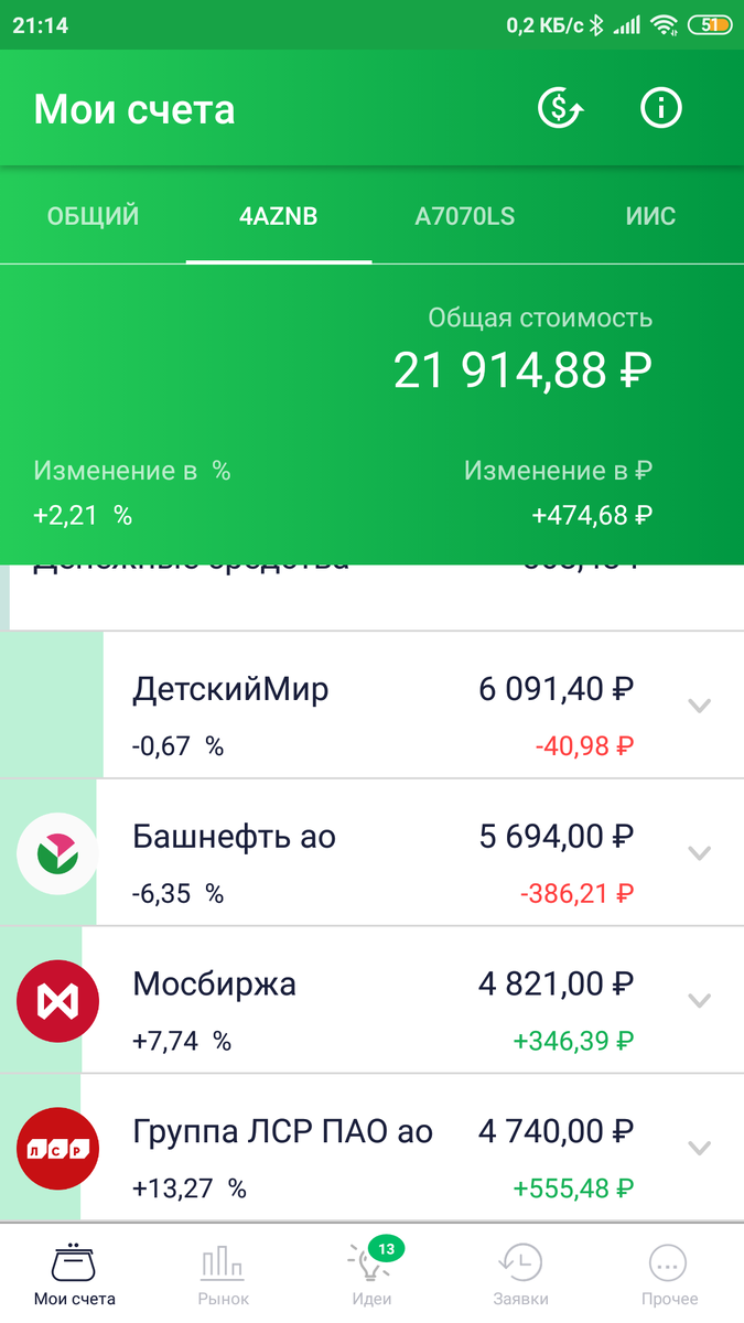 Всем привет! Это автор Дневника акционера. Сегодня последний день акции ЛСР торговались с дивидендами. Уже завтра их цена упадёт на 10-12% и тогда мой "портфель" знатно просядет. В душе я думаю, что этого не произойдет, но факты говорят о том, что падение будет достаточно крупное. Напомню, что я вложил 21 тысячу рублей в акции российских компаний. Почти за два месяца мой доход составил 914 рублей - просто представьте - это пассивный доход. Мне ничего не нужно делать, просто иногда покупать акции и "кормить" своего брокера для покупки акций. "Кормить" в том плане, что пополнять счёт на реальные деньги, оплачивать комиссия и другие расходы при совершении операций - кстати в июле я пока никаких операций не совершал. В моем "портфеле" сейчас четыре компании: ЛСР, Башнефть, Детский мир и Московская биржа. Я не буду обострять внимание на всех акциях, я уже довольно подробно об этом рассказывал, но суть в том, что сейчас доходность шести акций ЛСР в моём портфеле составляет 13,27%. Я мо