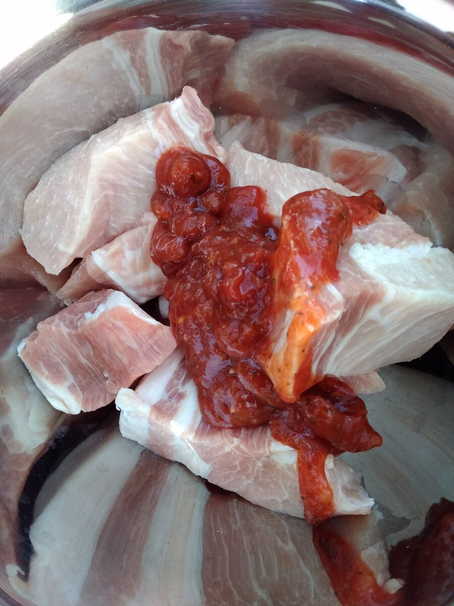 Я до сих пор вспоминаю с ностальгией, как в советские времена, мы часами вымачивали мясо в уксусе. Частенько потом ели совсем не шашлыки, а "деревянные кирпичи". Но несмотря на это, времена были прекрасные! В нашей семье шашлык-это не "раз в год по праздникам", а скорее наоборот, летом на даче каждую неделю и так приелось, что последние дни даже перешли на казан))) Я не буду называть себя "экспертом". Скорее я любитель, который просто получает удовольствие от процесса приготовления мяса. Сегодня я хочу рассказать самый простой способ маринования шашлыка. Делаю так уже несколько лет. Пишу подробно и с фото. 1. Я покупаю готовую мясную вырезку. Режу мясо на крупные куски. У нас сегодня мяса на 2 шампура, около 18 кусков. (Больше не сьедим). 2. "На глаз" добавляю кетчуп или его аналоги (у меня под рукой томатный соус Rikko). Соус немного острый и его добавляю немного, а то дети есть не будут. 3. Затем майонез. Я люблю пожирнее и поэтому майонеза больше, чем кетчупа. 3. Сверху посыпаю спе