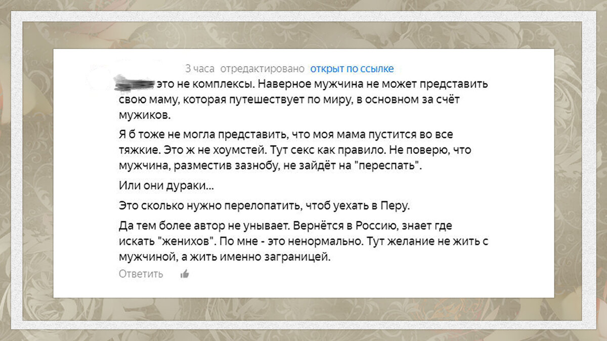 Текст комментария Я бы тоже не могла представить, что моя мама пустится во все тяжкие. Это ж не хоумстей. Тут ....... как правило. Не поверю, что мужчина , разместив зазнобу, не зайдет на "переспать". Или они..... Это сколько нужно перелопатить, чтобы уехать в Перу. Да тем более автор не унывает. Вернётся в Россию, знает где искать "женихов". По мне - это ненормально. Тут желание не жить с мужчиной, а жить именно заграницей. Примечание : Некоторые слова заменила точками, так как они относятся к стоп - словам и статья не будет показываться в ленте, а только подписчикам. Вот так пробежалась по мне, одна из моих постоянных читательниц. Периодически она оставляет и вполне корректные высказывания. Этот комментарий я, конечно же, удалила. Но в нём я вижу два скрытых вопроса, на которые хочу ответить. Начну с первого вопроса Моим сыновьям на момент моих путешествий было 22 года. Они вернулись из армии. Взрослые воспитанные парни, у которых на тот момент были девушки. Я не лезла со своим