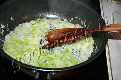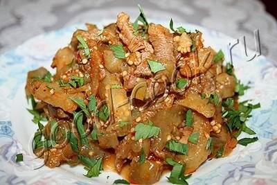 Проблем при приготовлении нет, но есть проблемы при поедании. Очень тяжело удержаться от того, чтобы не съесть этот салат ещё горячим - в качестве второго блюда. Горячий салат тоже очень вкуснен, но не очень сытен, ведь мяса довольно мало. Но если подождать несколько часов, то салат дозреет, вкус усилится и он заиграет новыми красками. СОСТАВ ~1кг баклажанов, 200~250г мякоти свинины, 1 крупная луковица (200г), 2 болгарских перца (~150г), 1,5 ч ложки соли, 4 ст ложки растительного масла, 1/4 ч ложки чёрного перца, на кончике ножа острого красного перца, при желании - 1~2 ч ложки молотой паприки Лук мелко порезать. Сотейник поставить на средний огонь, налить в него масло и насыпать лук.